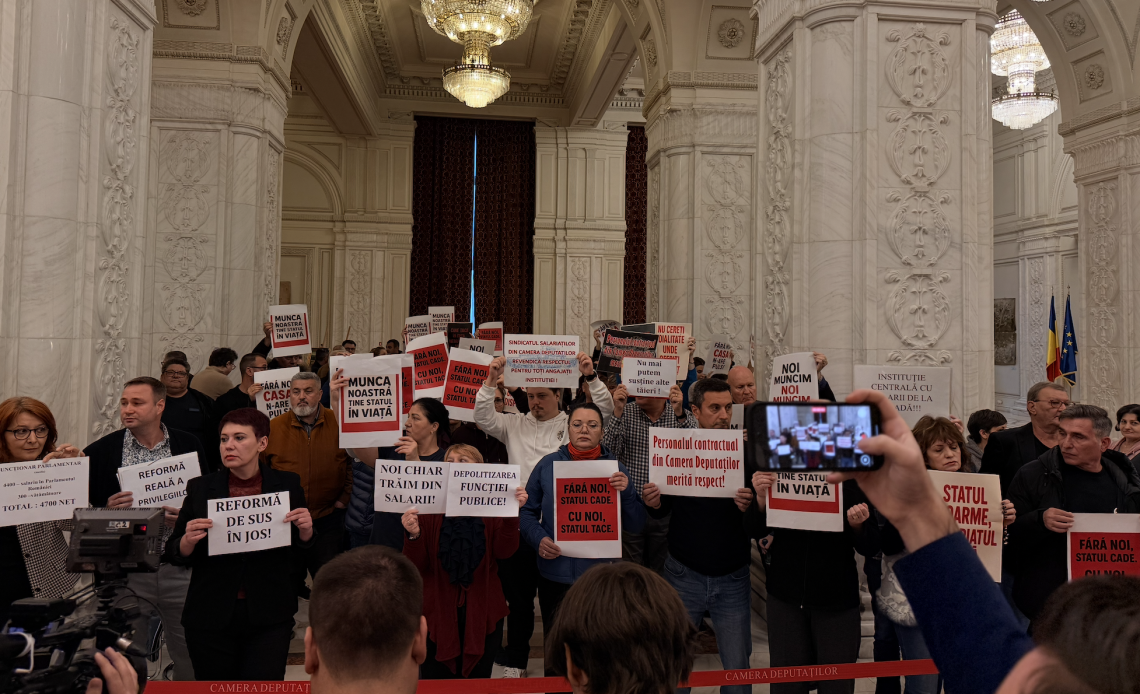 Zeci de angajați ai Parlamentului, de la personal tehnic, liftiere și șoferi s-au mobilizat marți într-un protest pe holul central al forului, nemulțumiți de tăierile de bani anunțate de Guvern.